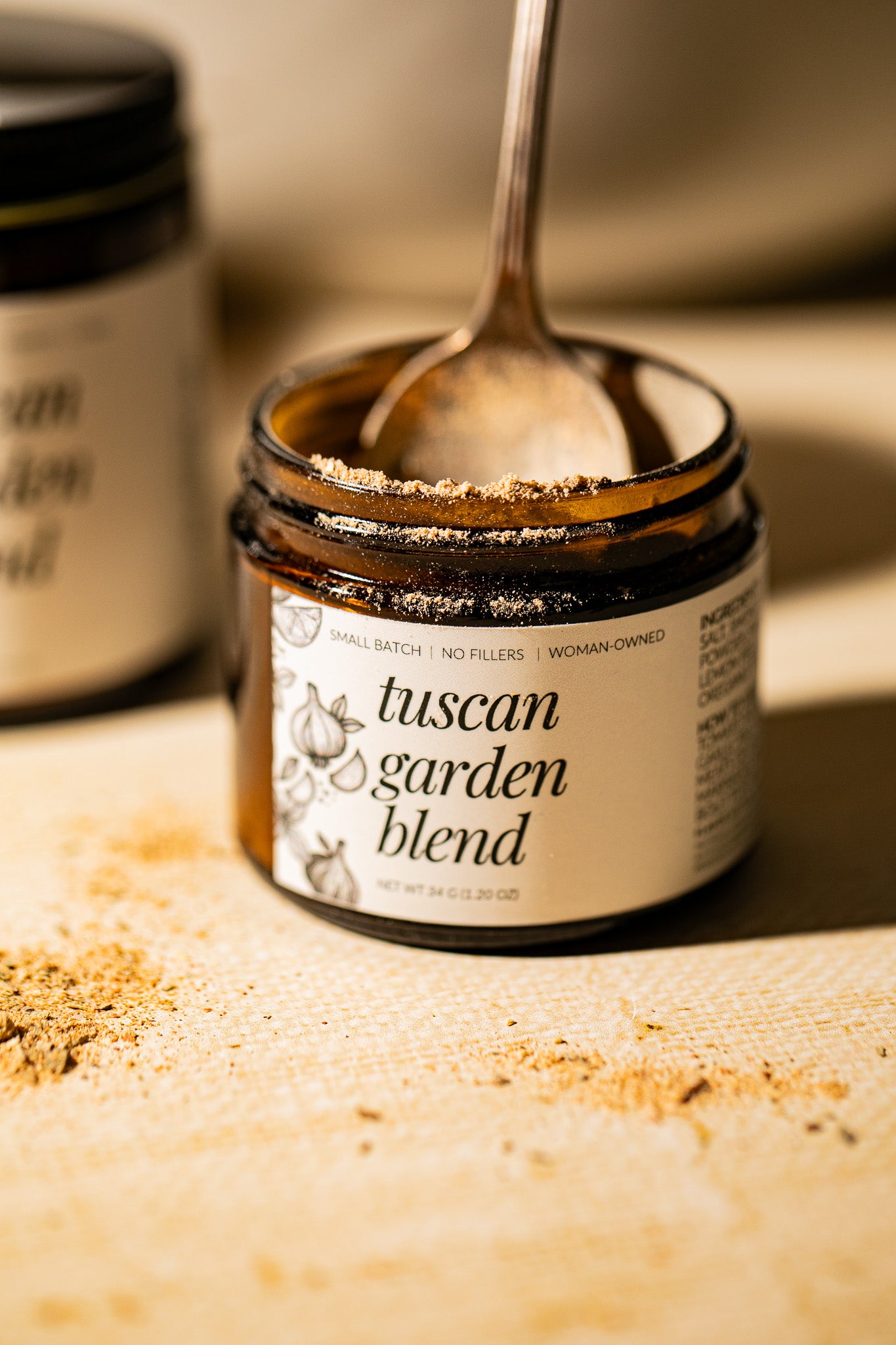 Tuscan Garden Blend: Garlic powder, sea salt, smoked paprika, onion powder, basil, tomato powder, lemon peel, black pepper, oregano, thyme