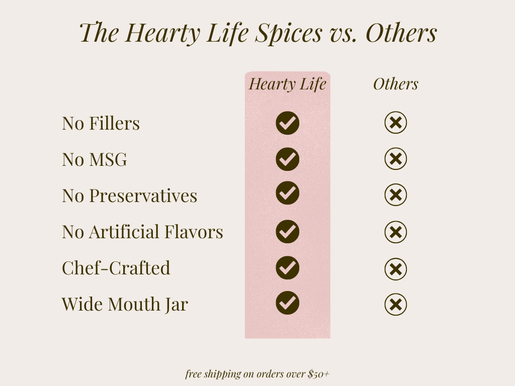Not all spice blends are created equal. Every Hearty Life blend is chef-crafted with real ingredients, no fillers, and no shortcuts. From the wide-mouth jar to the flavor in your food, quality shows up in every detail.