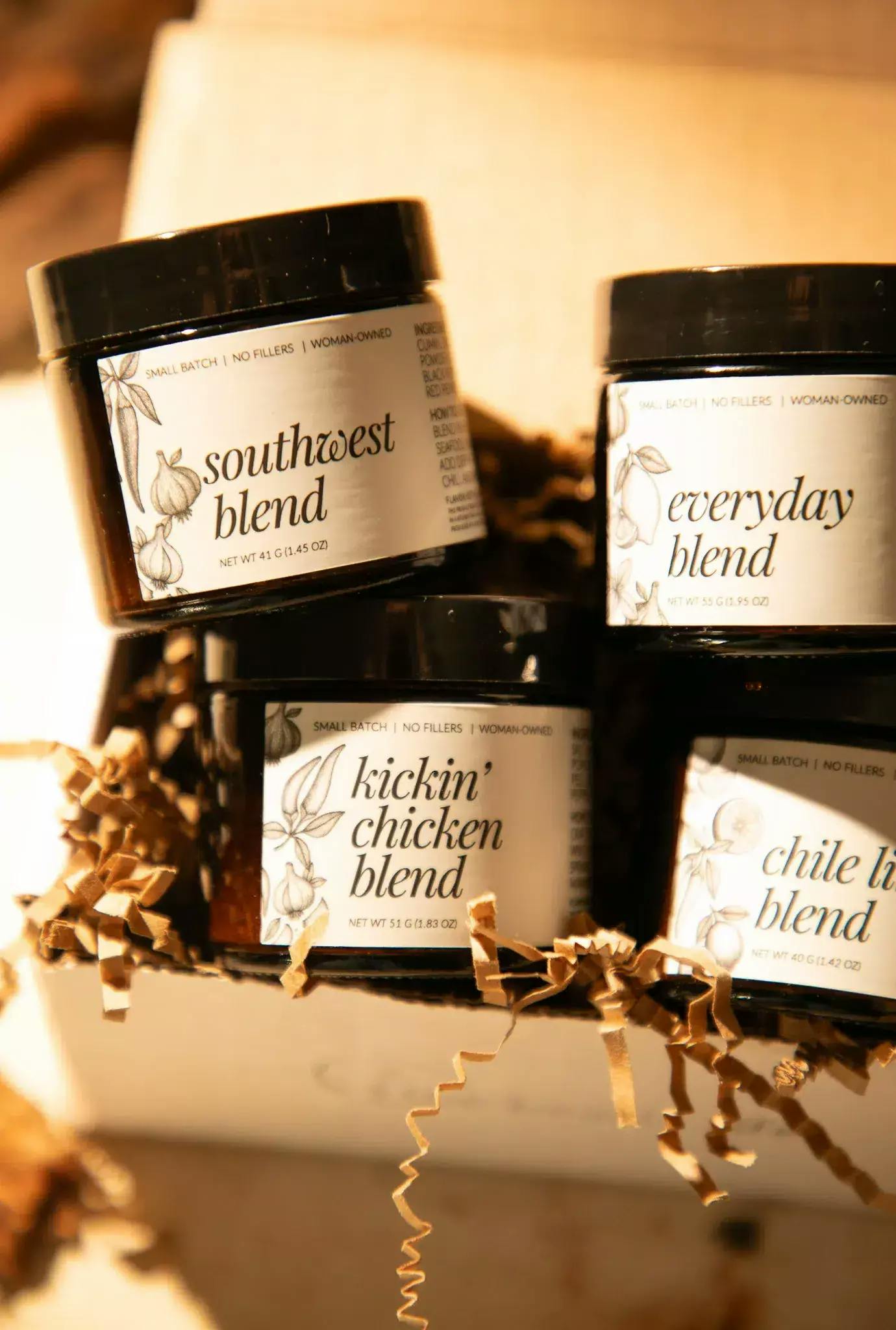 Four mini spice jars filled with my signature blends, crafted to bring vibrant flavor to your favorite recipes. Each blend is made with high-quality ingredients, no fillers, and packed in our signature glass jars for freshness and sustainability.